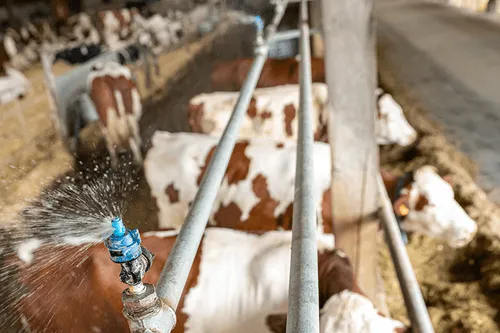 Met het Cow Cooling systeem van DeLaval wordt de koe met een grove druppel tot op de huid natgemaakt, waarna de DDF1200 ventilatoren de koe droogblazen, dit op basis van de ingestelde THI. De cyclus blijft zich herhalen totdat de THI weer onder de ingestelde waarde komt. Automatisering zorgt ervoor dat je nooit te laat start met het voorkomen van hittestress.